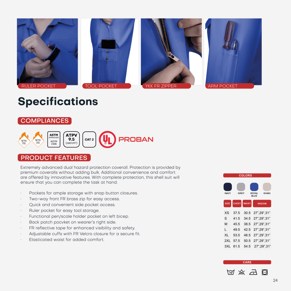 Certified to NFPA 70E, NFPA 2112, and ASTM standards, our flame resistant (FR) coveralls deliver reliable protection against fire, arc flash, and other industrial hazards. With smartly engineered pockets, durable closures, and reflective features, these uniforms are tailored for professionals working in oil & gas, petrochemical, and industrial fields.